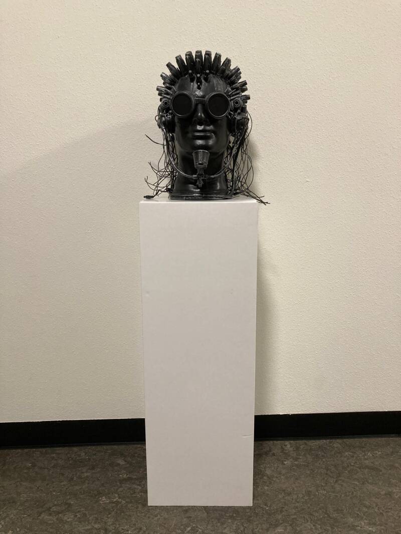 Gemaakt met oa. zwembril, koptelefoons, dopjes van pennen, koffiefilters en computer onderdelen.